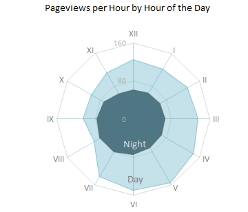 Given that the 12-hour clock is a difficult metaphor to use for a visualization, many people choose to use a 24-hour circle. 24-hour circular charts typically start with midnight at the top of the chart and then proceed clockwise, showing all 24 hours in one 360-degree range. The benefit of a 24-hour circular chart is that the cyclical nature of the data is represented and the viewer can easily read the continuity at any point on the chart.