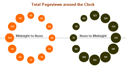 The biggest problem with the chart is the incorrect continuity. A single clock on its own isn’t a continuous range, it’s really only half a range. So the clock on the left is showing 12am – 12pm, but when you reach the end of the circle the data doesn’t continue on like the representation shows. Instead you need to jump over to the second clock and continue on around. It’s difficult to see the ranges right around both 12pm and 12am, since you lose context in one direction or another (and worse, you get the incorrect context from the bordering bubbles).